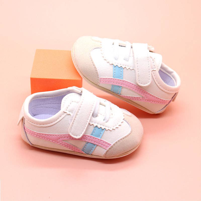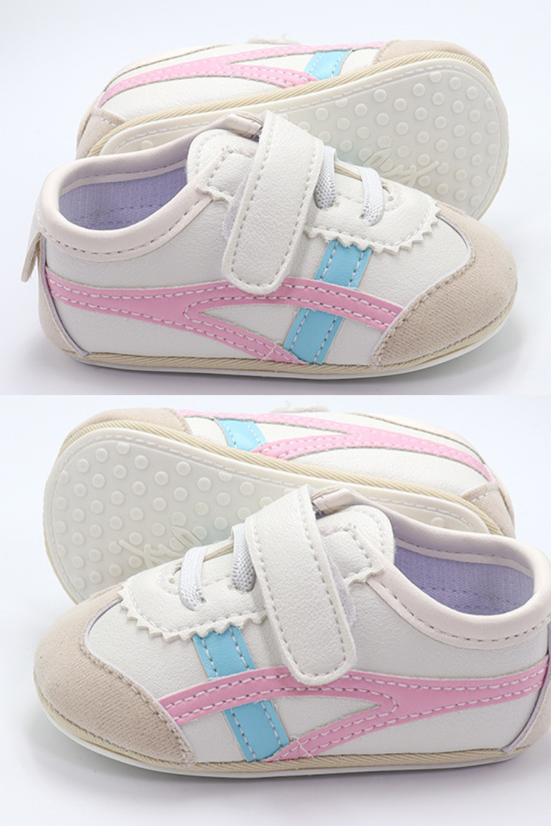 Off white infant tennis shoes with pink & blue design & velcro. YSA007P